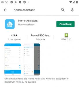 Mam telefon ze systemem Android. Wchodzę więc na sklep z aplikacjami Google Play, wyszukuję aplikację o nazwie Home Assistant i instaluję ją.
