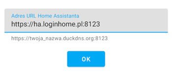 Pierwsze uruchomienie aplikacji wymaga wprowadzenia adresu instancji mojego Home Assistant.