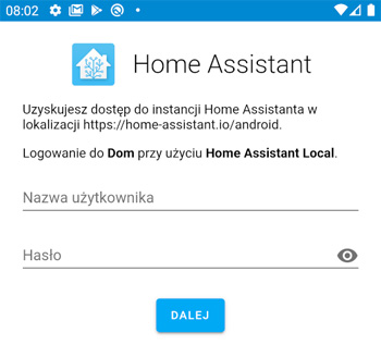 Wpisuję moje dane do logowania do Home Assistant i przechodzę dalej.