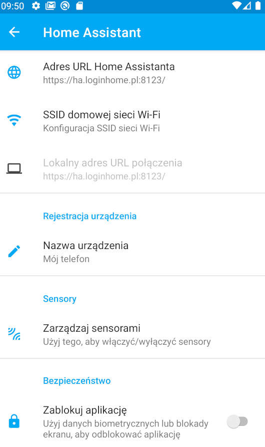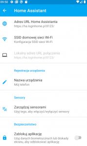 Gdy uruchomię na telefonie aplikację Home Assistant to w lewym menu jest dodatkowa opcja Konfiguracja aplikacji.
