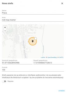 Wpisuję nazwę dla strefy, wskazuję na mapie lokalizację. Ustawiam też promień zasięgu strefy.