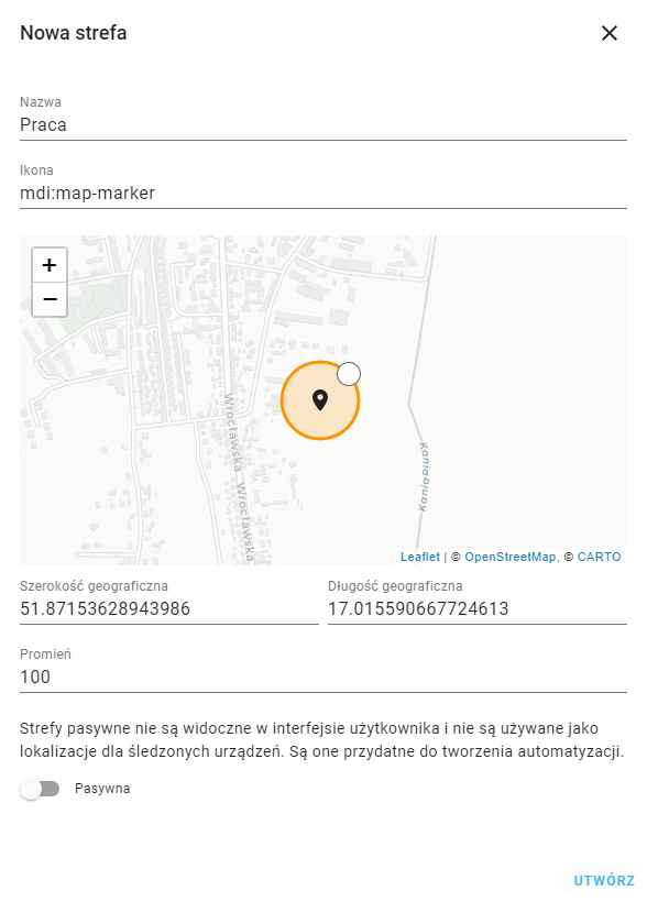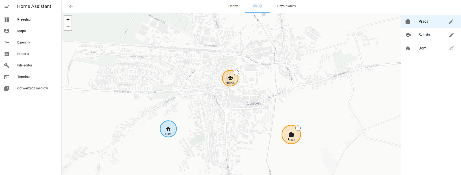 Home Assistant pozwala na dodawanie własnych stref na mapie, np. miejsca zamieszkania, pracy, szkoły.