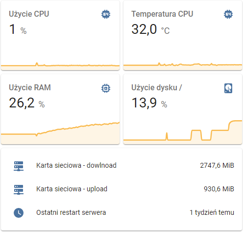 A Home Assistant będzie miał encję ze stanem, który będzie zasilany tym wynikiem, i będzie go pokazywać na karcie we widoku SERWER.