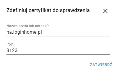 W oknie w polu Nazwa hosta wpisuje swoją subdomenę ha.loginhome.pl, a port zmieniam na 8123 i klikam ZATWIERDŹ.