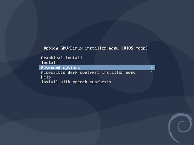 Debian GNU/Linux installer menu -> wybieram Advanced options (Enter)