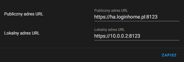 W polu Publiczny adres URL wpisuję https://ha.loginhome.pl:8123, a w polu Lokalny adres URL wpisuje https://10.0.0.2:8123 i wciskam ZAPISZ.