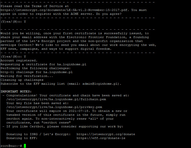 Instaluję więc kontener z klientem Certbot i generuję certyfikat dla subdomeny ha.loginhome.pl, podając też mój adres email.