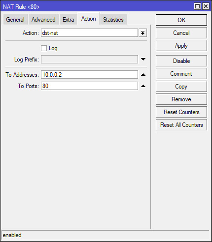 Na zakładce Action w polu Action wybieram dst-nat, w polu To Addresses wpisuję 10.0.0.2, w polu To Ports wpisuję 80i wciskam OK