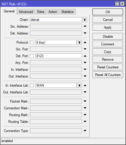 Na zakładce General w polu Chain wybieram dstnat, w polu Protocol wybieram 6 (tcp), w polu Dst. Port wpisuję 8123