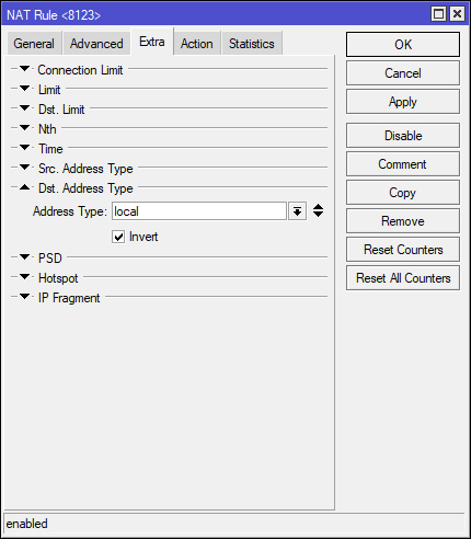 Na zakładce Extra w sekcji Dst. Address Type w polu Address Type wybieram local i zaznaczam pole Invert (w niektórych przypadkach przekierowanie działa bez zaznaczenia tego pola!)