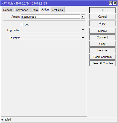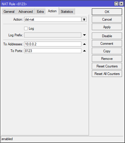 Na zakładce Action w polu Action wybieram dst-nat, w polu To Addresses wpisuję 10.0.0.2, w polu To Ports wpisuję 8123 i wciskam OK