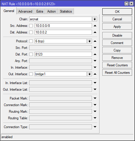 Na zakładce General w polu Chain wybieram srcnat, w polu Src. Address wpisuję 10.0.0.0/8, w polu Dst. Address wpisuję 10.0.0.2, w polu Protocol wybieram 6 (tcp), w polu Dst. Port wpisuję 8123, w polu Out Interface wybieram bridge1