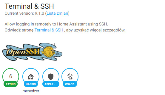 Na panelu Home Assistant z lewego dolnego menu wybieram Supervisor, a dalej u góry Sklep z dodatkami. Odszukuję dodatek Terminal & SSH, otwieram go i klikam ZAINSTALUJ.