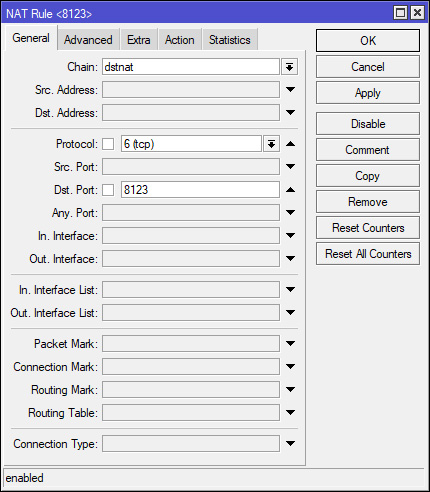 Na zakładce General w polu Chain wybieram dstnat, w polu Protocol wybieram 6 (tcp), w polu Dst. Port wpisuję 8123